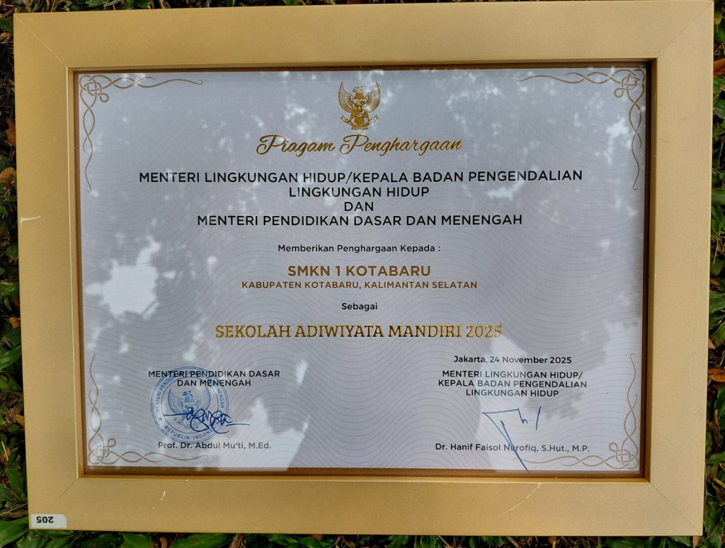 SMK Negeri 1 Kotabaru kembali menorehkan prestasi membanggakan dengan meraih Penghargaan Adiwiyata Mandiri 2025, penghargaan tertinggi dalam program sekolah berbudaya lingkungan yang diselenggarakan oleh Kementerian Lingkungan Hidup dan Kehutanan (KLHK) Republik Indonesia.